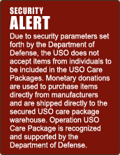 For further information on Operation USO Care Package, please e-mail questions@USOCarePackage.org. |
